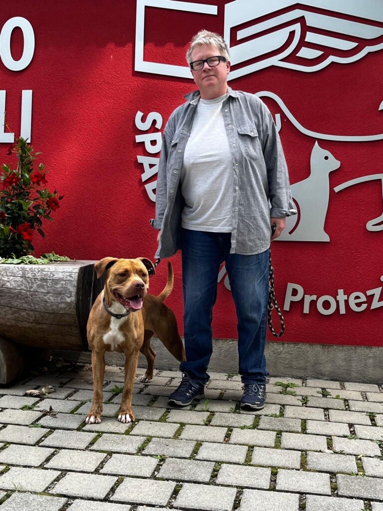 Rasch posieren für das obligate Abschiedsfoto vor dem Tierheim, dann gingen wir zum Auto. Wir fuhren aber nicht gleich los, sondern wir setzten uns wiederum eine Weile in den Kofferraum. Auch damit sich die Leute, die sich liebevoll um Chany gekümmert hatten, sich von ihr verabschieden konnten. Va a casa.