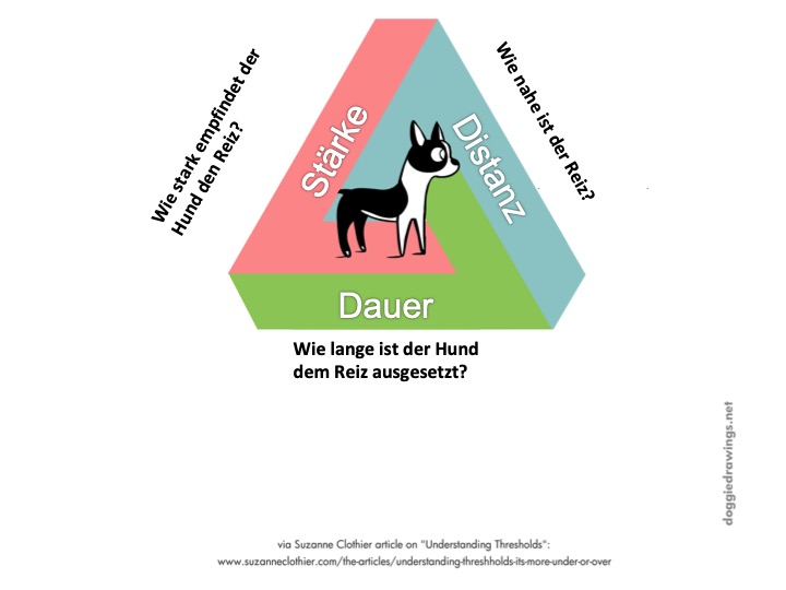 Komm hinzu, dass nicht alle Reize oder Situationen den Hund gleichermassen aufregen. Hier kommen die Faktoren Dauer und Distanz ins Spiel. So empfindet ein Hund auch starken Stress, wenn ein an und für sich milder Reiz zu nahe kommt oder er diesem zu lange ausgesetzt ist.