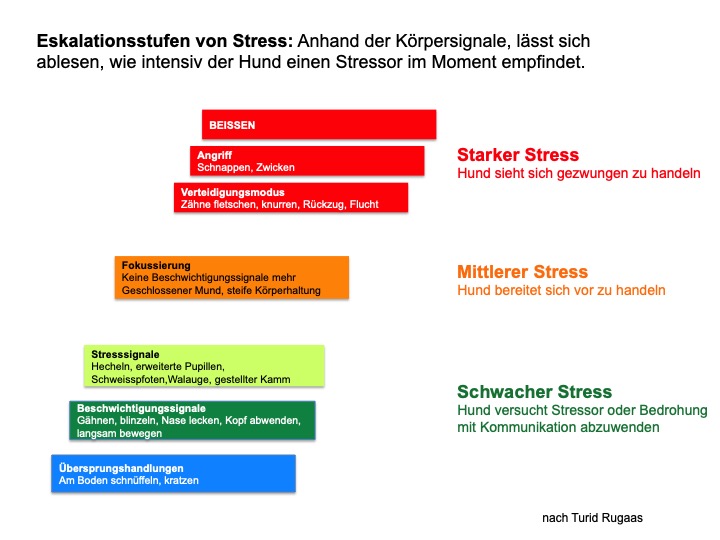 Bis der Hund jedoch in die rote Zone gerät, durchläuft er in der Regel verschiedene Stufen des Stress. Auf welcher Stufe er gerade steht, kann man an seiner Körpersprache ablesen.