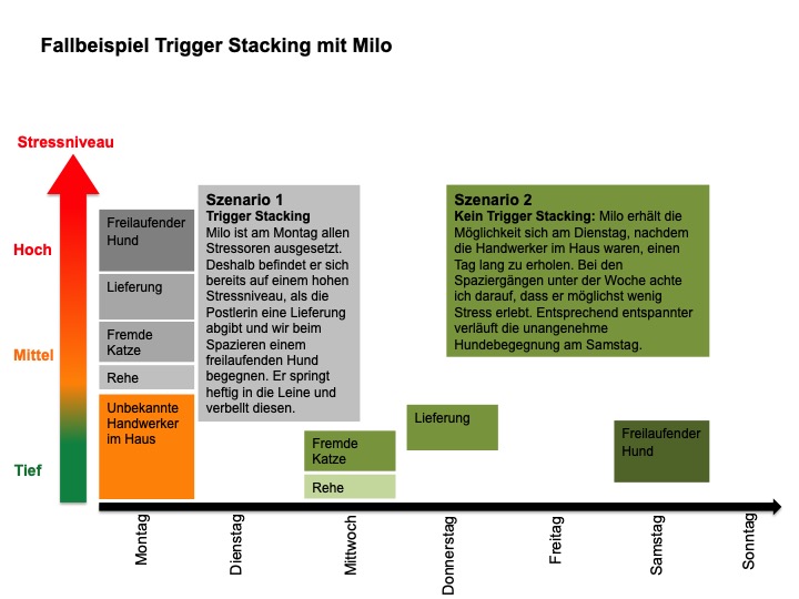 Ausgehend von einer sehr belastenden Situation mit Handwerkern im Haus am Montag, ergeben sich für Milo zwei Szenarien: Entweder kommt es aufgrund von Trigger Stacking bereits am Montag zu einer sehr unangenehmen Situation mit einem freilaufenden Hund (Szenario 1). Oder wir erleben dank bewusstem Umgang mit Stress am Samstag eine wesentlich entspanntere Begegnung mit einem freilaufenden Hund (Szenario 2).